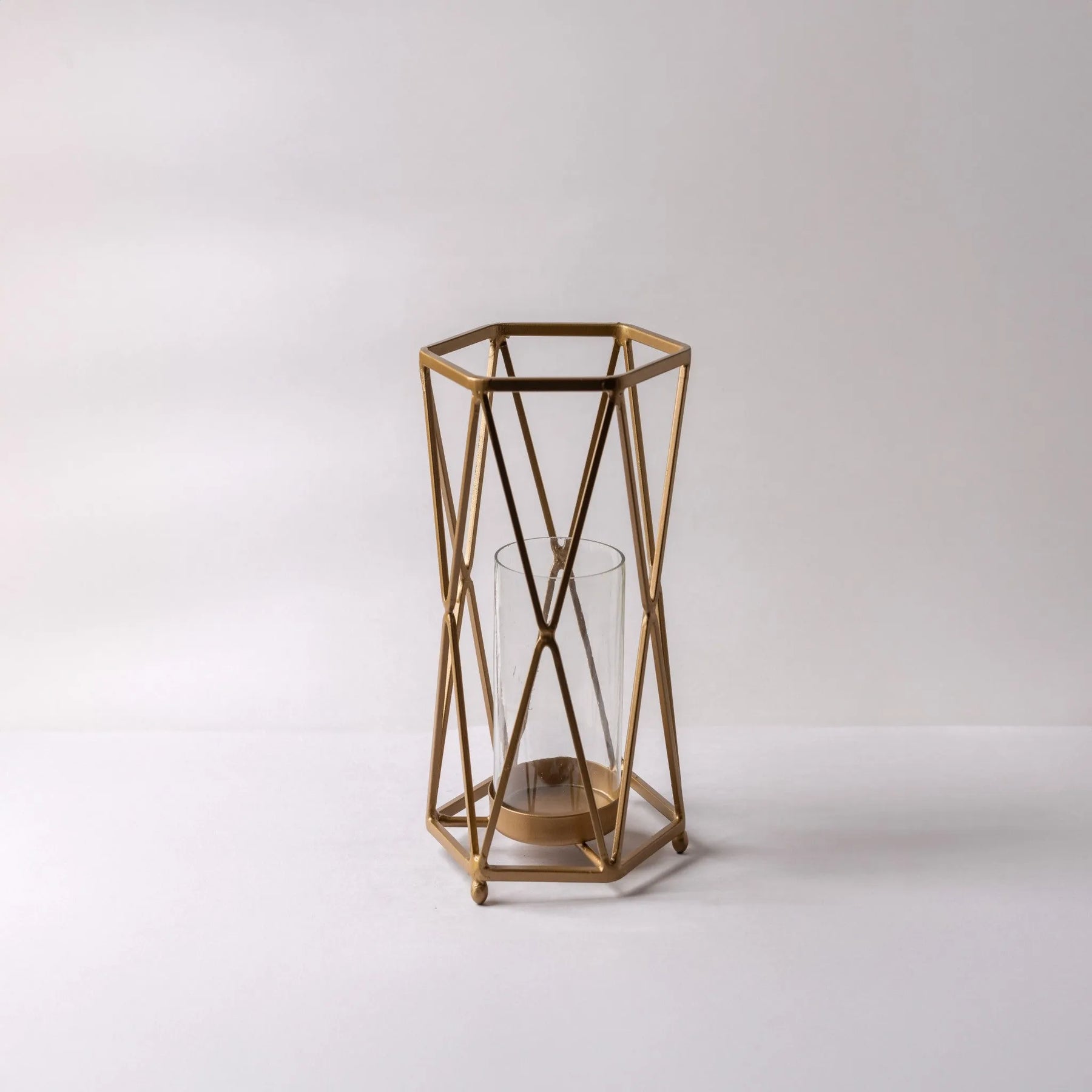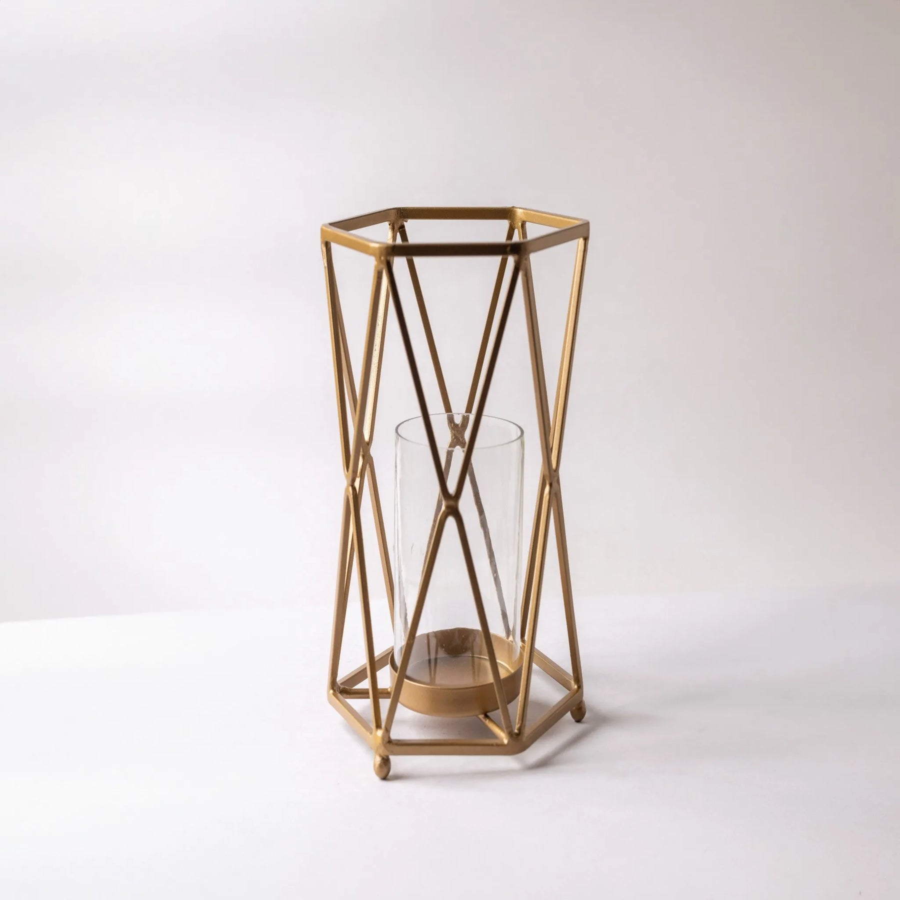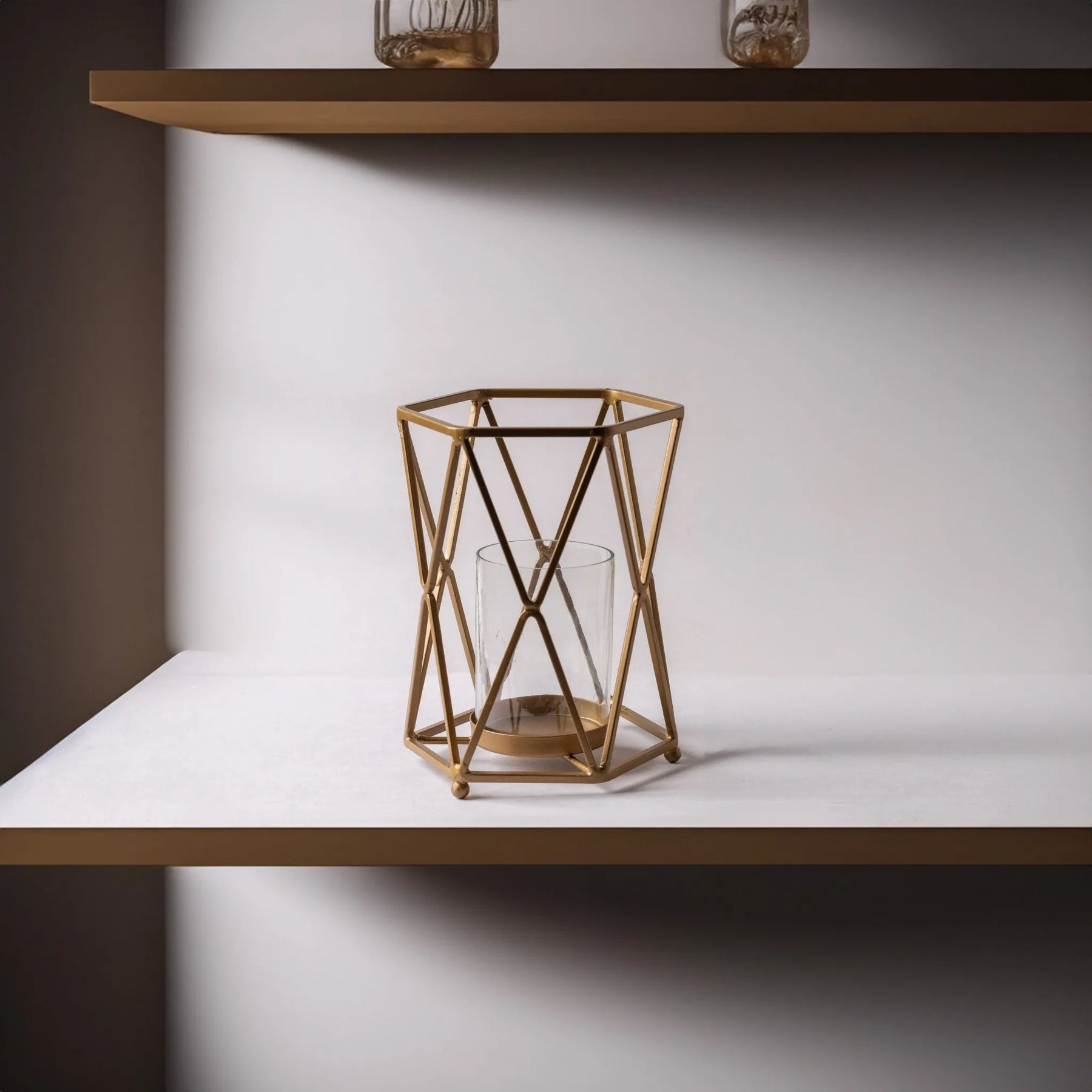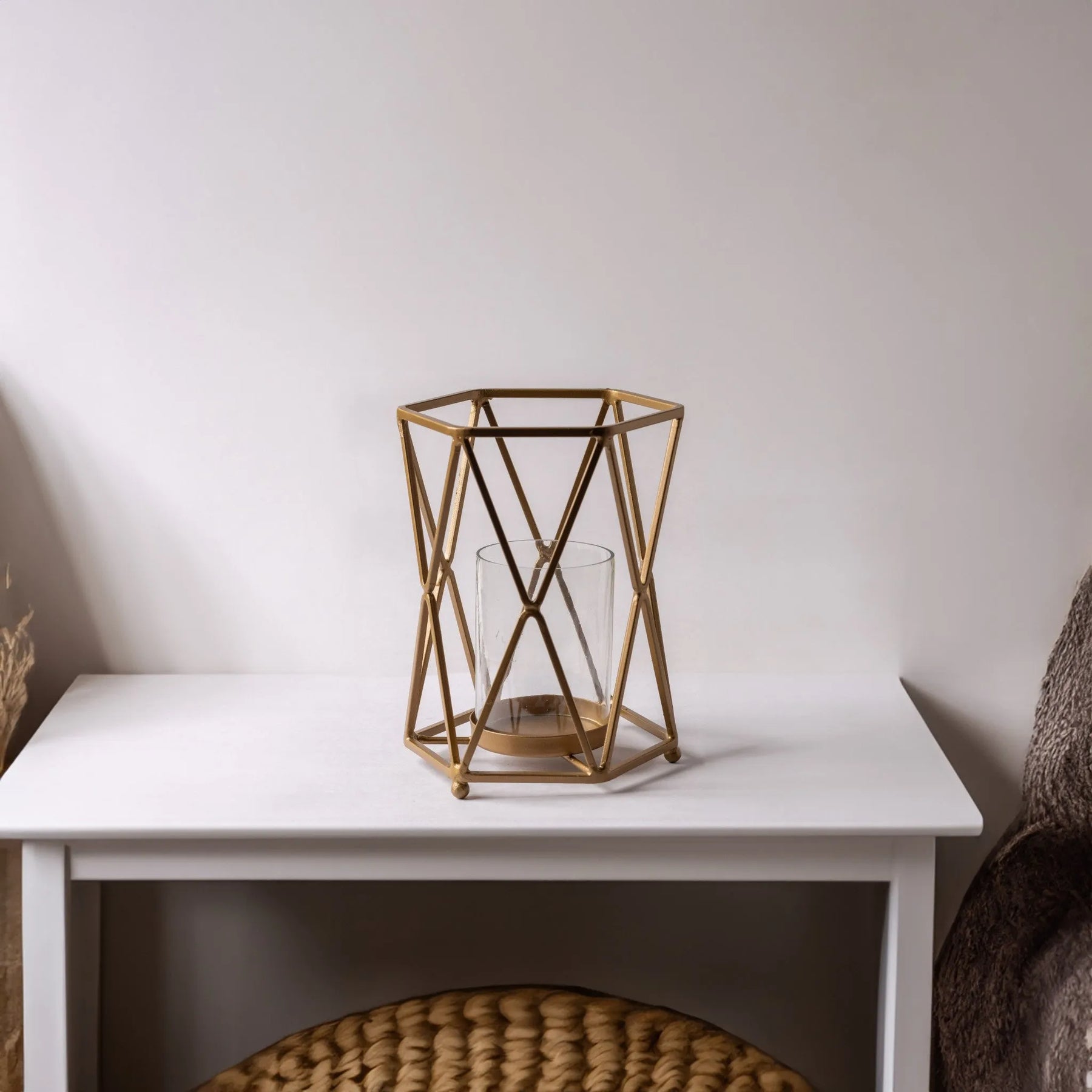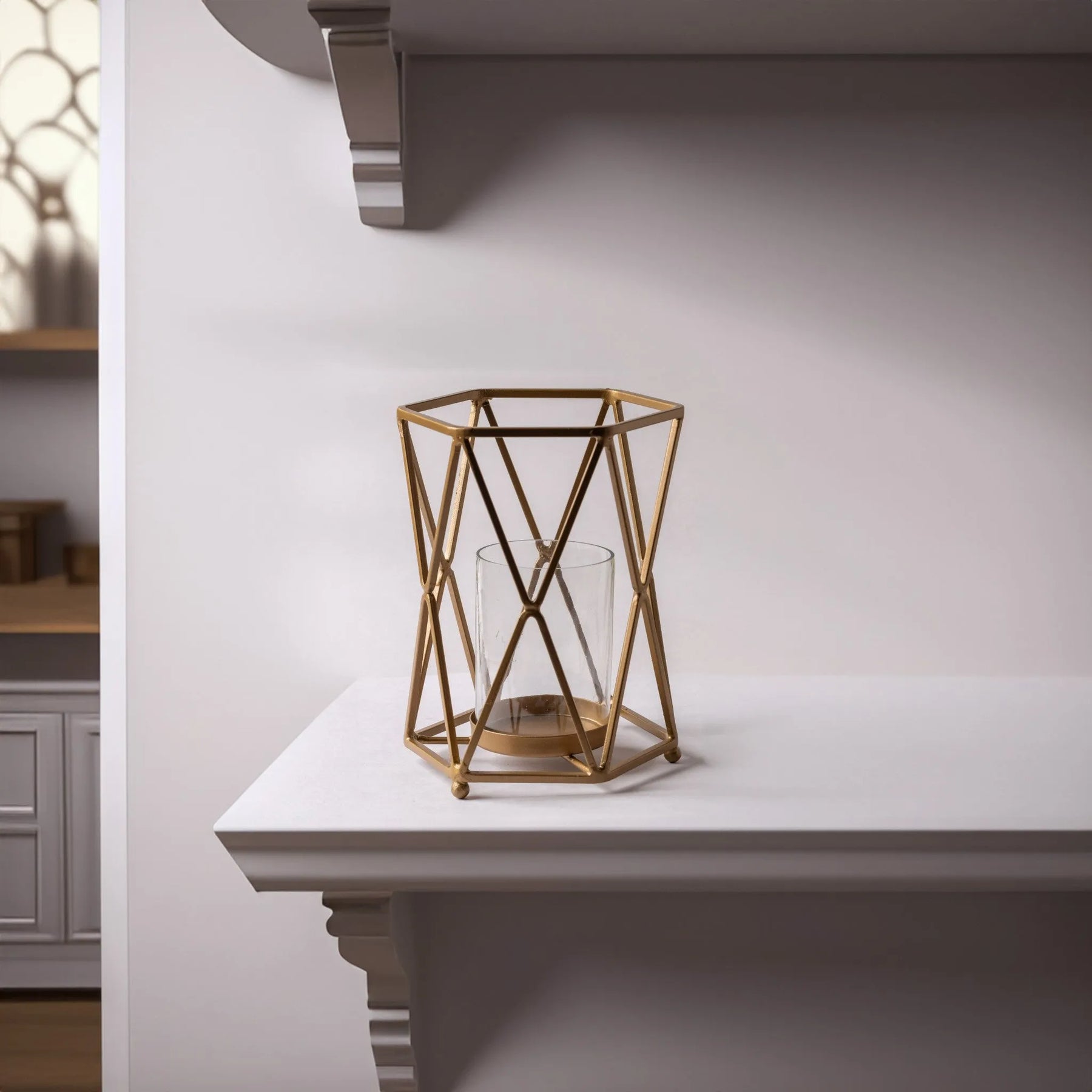 Add a touch of modern elegance with the Geometric Glass and Metal Pillar Candle Holder. Featuring a striking geometric design and a sleek metal frame, this candle holder beautifully highlights the elegance of your pillar candles. Perfect for creating a sophisticated ambiance, it effortlessly enhances any room, from your living space to your dining area, adding a touch of chic refinement to your decor.